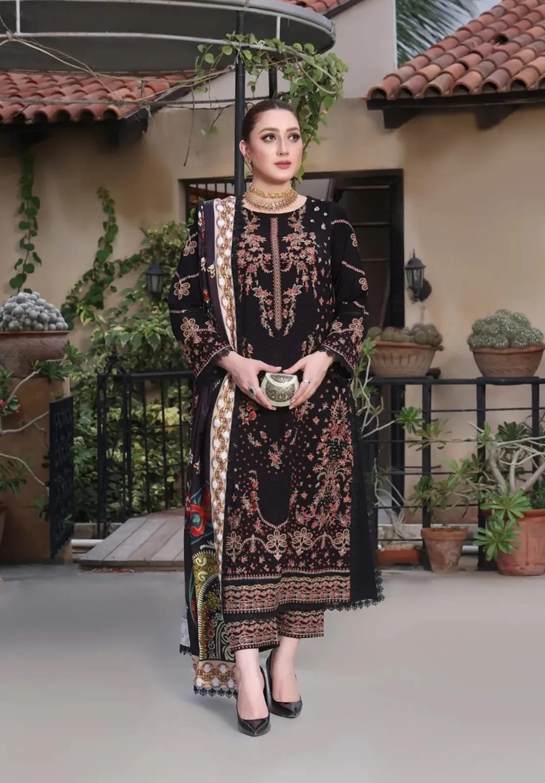 Digital printed whool shawal With Four side lace attached