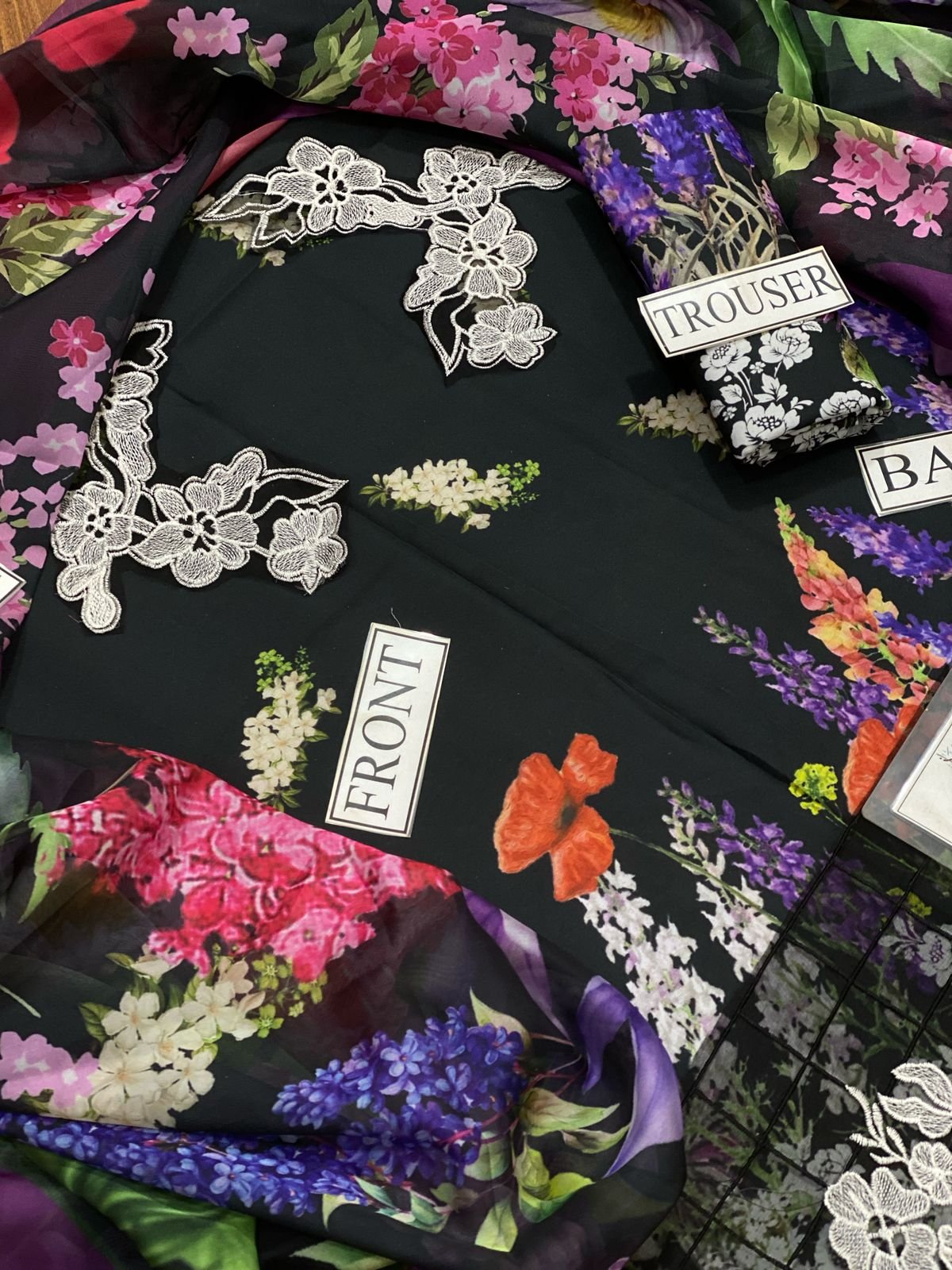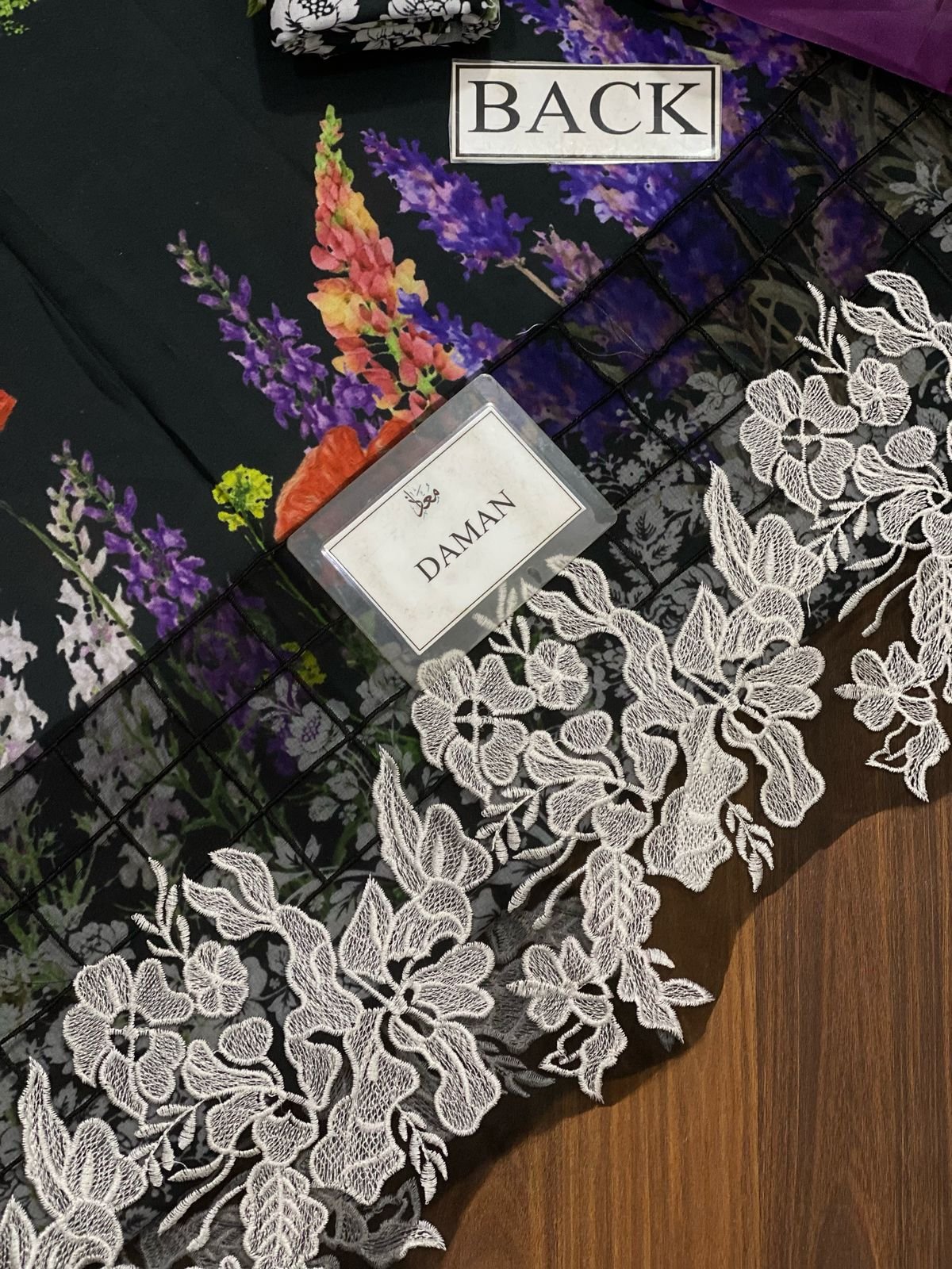 Printed Swiss With Embroidered Daman and Neck on Organza