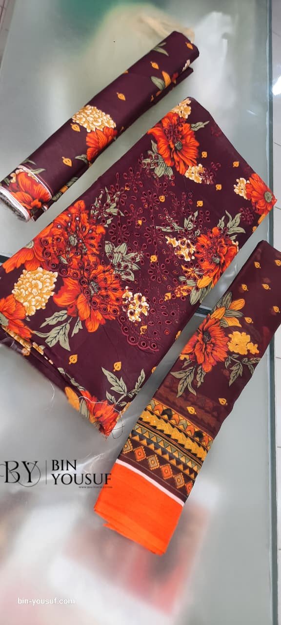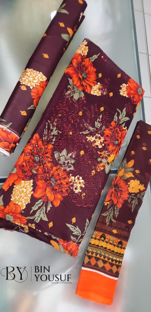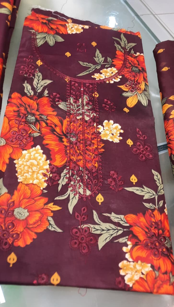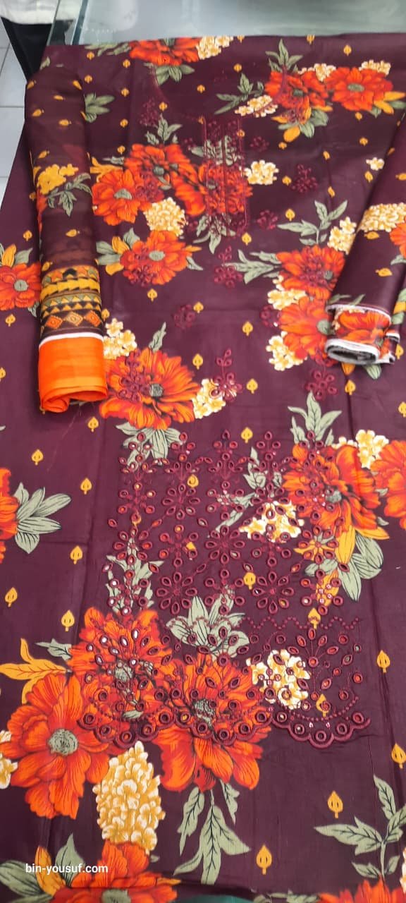 3pcs Lawn Embroidered Dress With Front Embroidered Daman Chikankari With Applic Attach And Chiffon Printed Dupatta With Printed Trouser