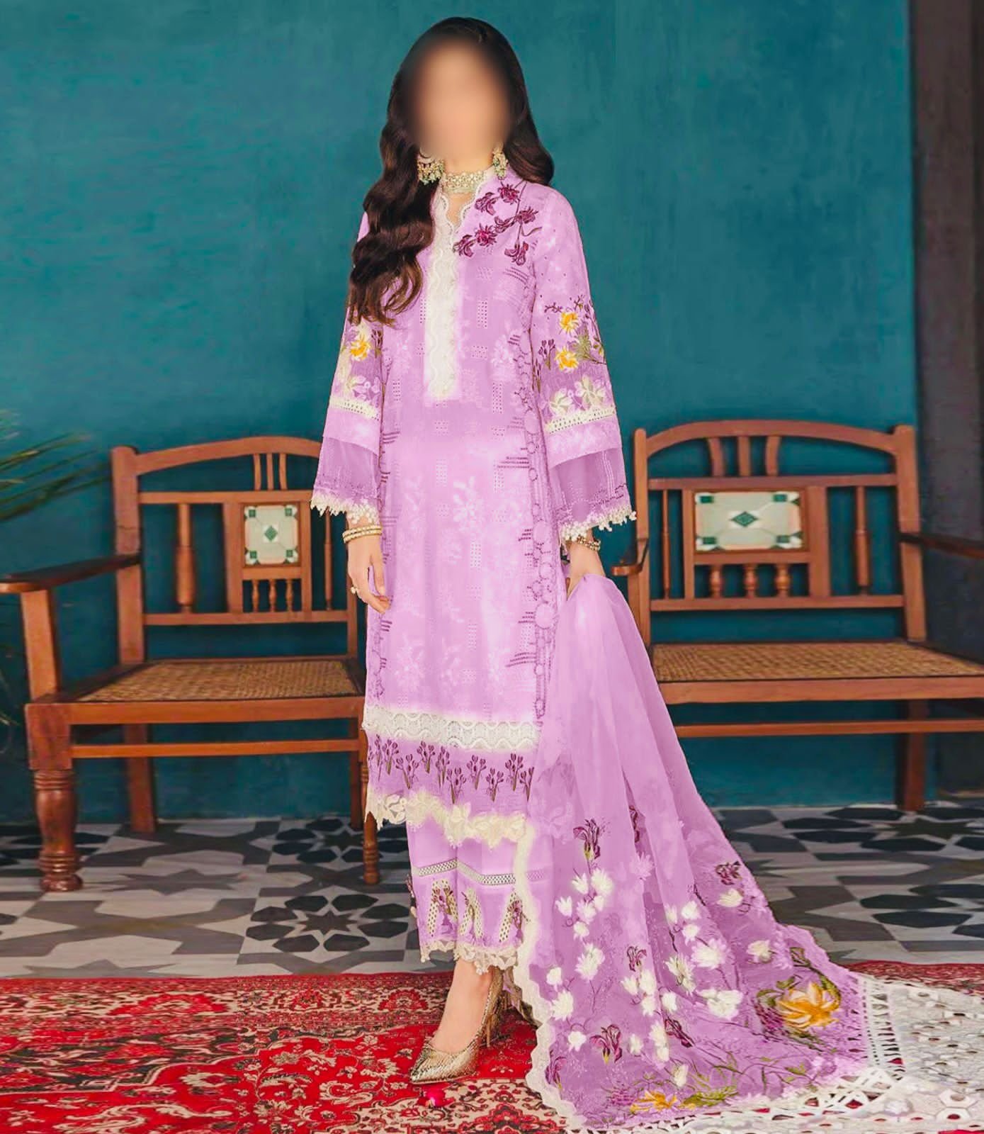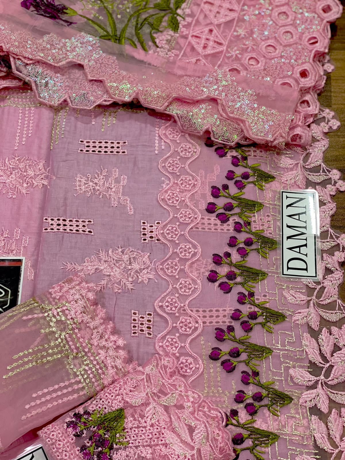 lawn fully heavy embroidered schifflie front with heavy embroidered neck lace with heavy embroidered spengle work daman border with heavy embroidered front bunch