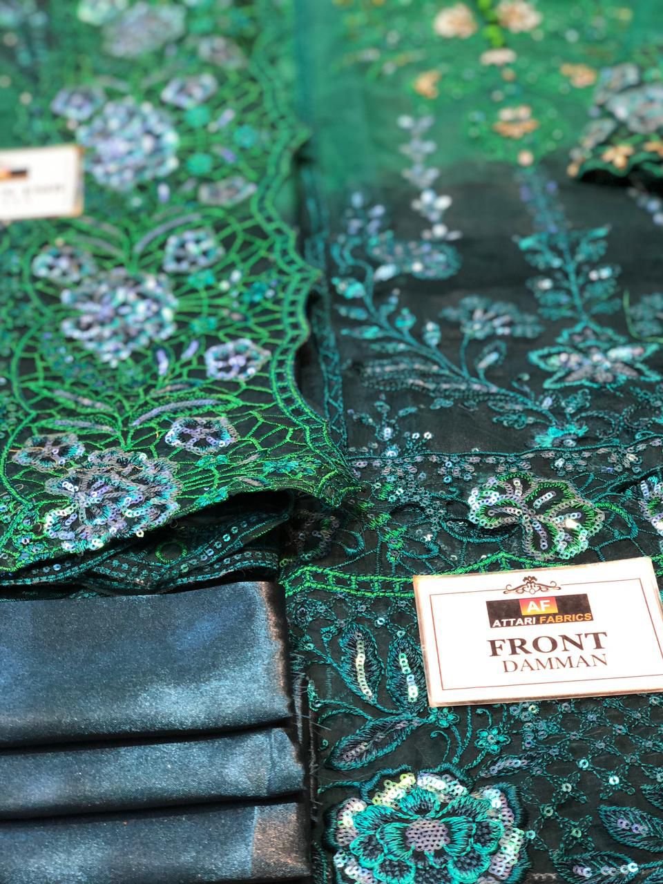 chiffon tie & die fully heavy embroidered spengle centre panel with fully hand emblishment adha work with 2 side fully heavy embroidered spengle work left & right panel attach with fully heavy embroidered spengle work daman border with fully cut work with hand emblishment adha work with fancy tulses attach