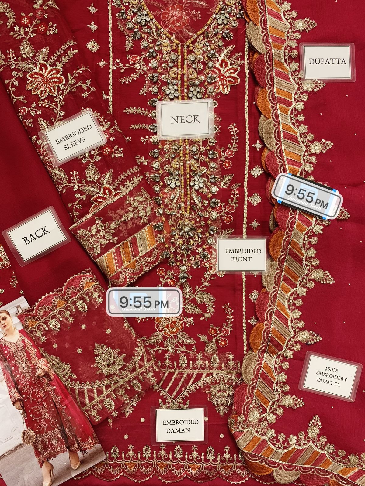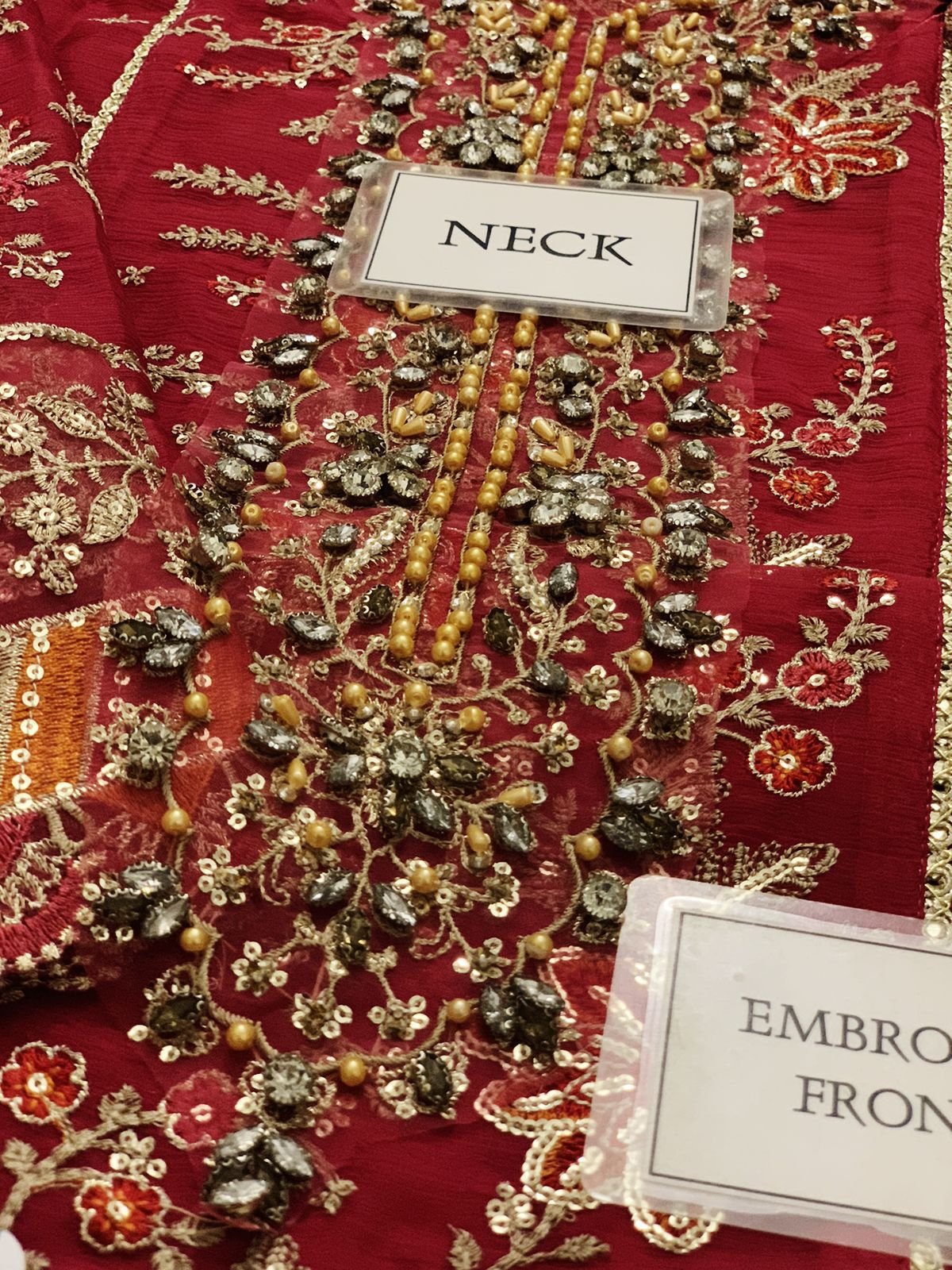 chiffon fully heavy embroidered spengle work centre panel with heavy embroidered spengle work neckline with heavy hand emblishment adha work with heavy embroidered spengle work side panel attach with heavy embroidered spengle work daman border