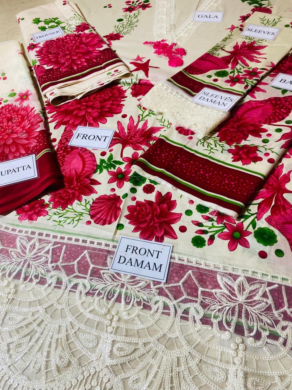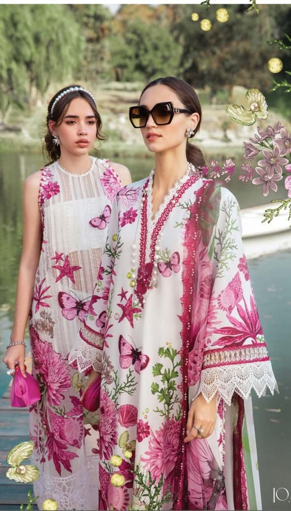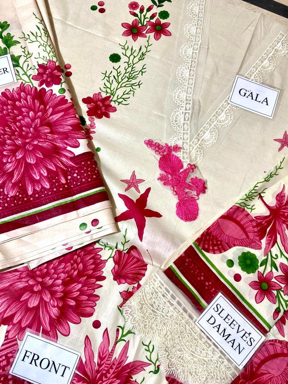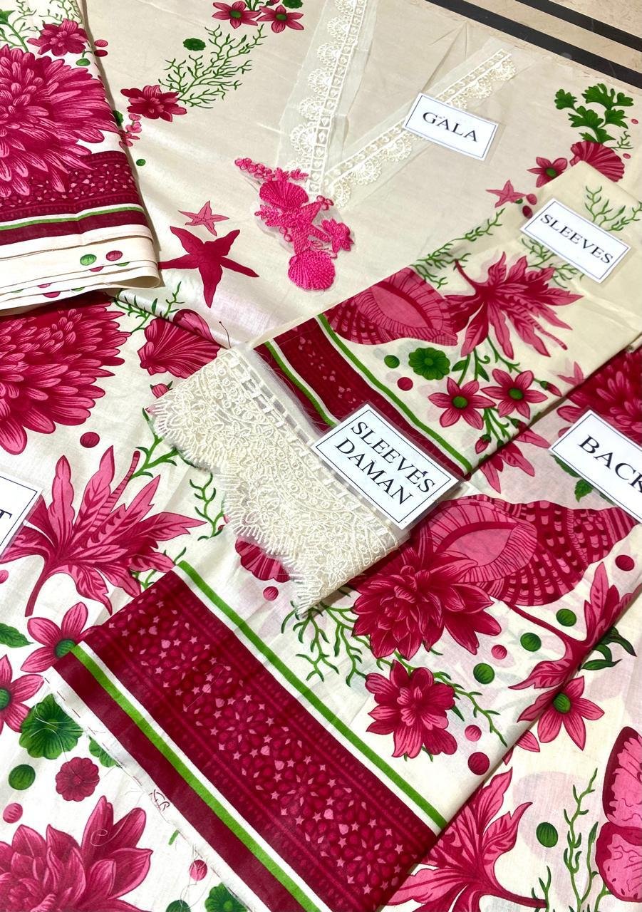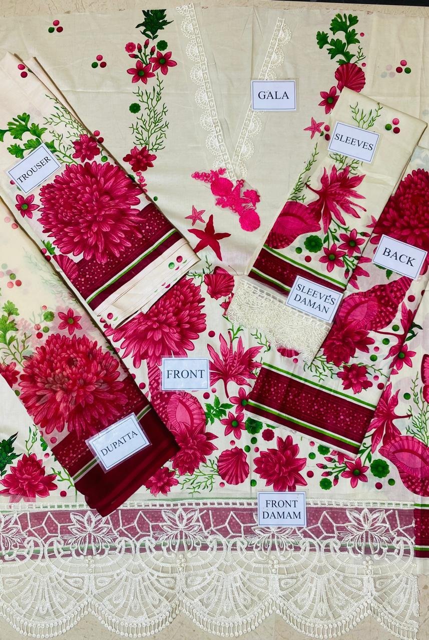 Printed lawn 90*70 front with heavy embroidered spengle work neck patch & heavy daman boarder with spangle wrok and 1 embroiderd button patch