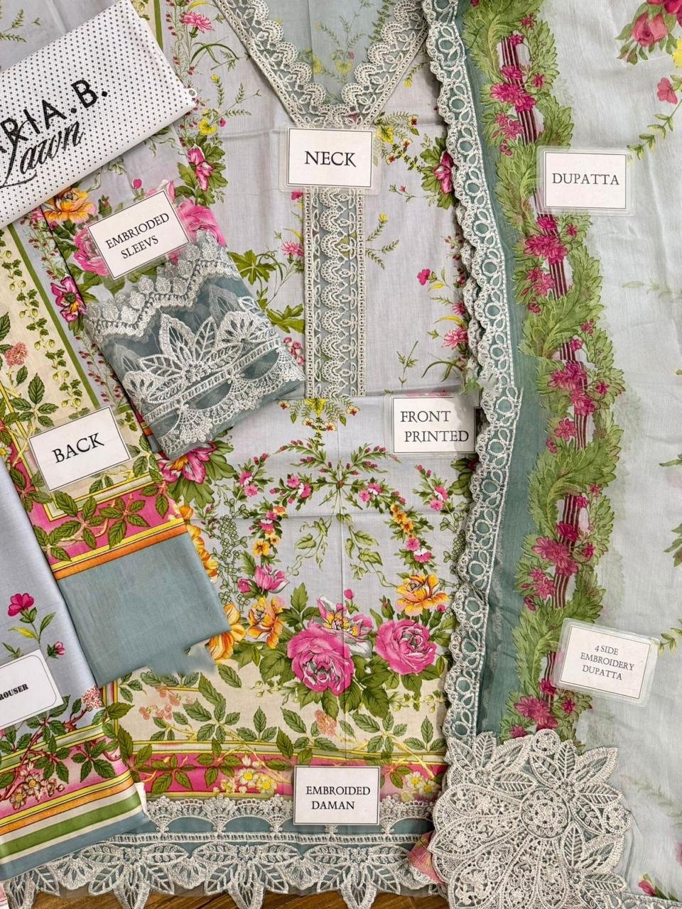 printed lawn with fully heavy embroidered spengle work neckline with heavy embroidered spengle work daman boarder
