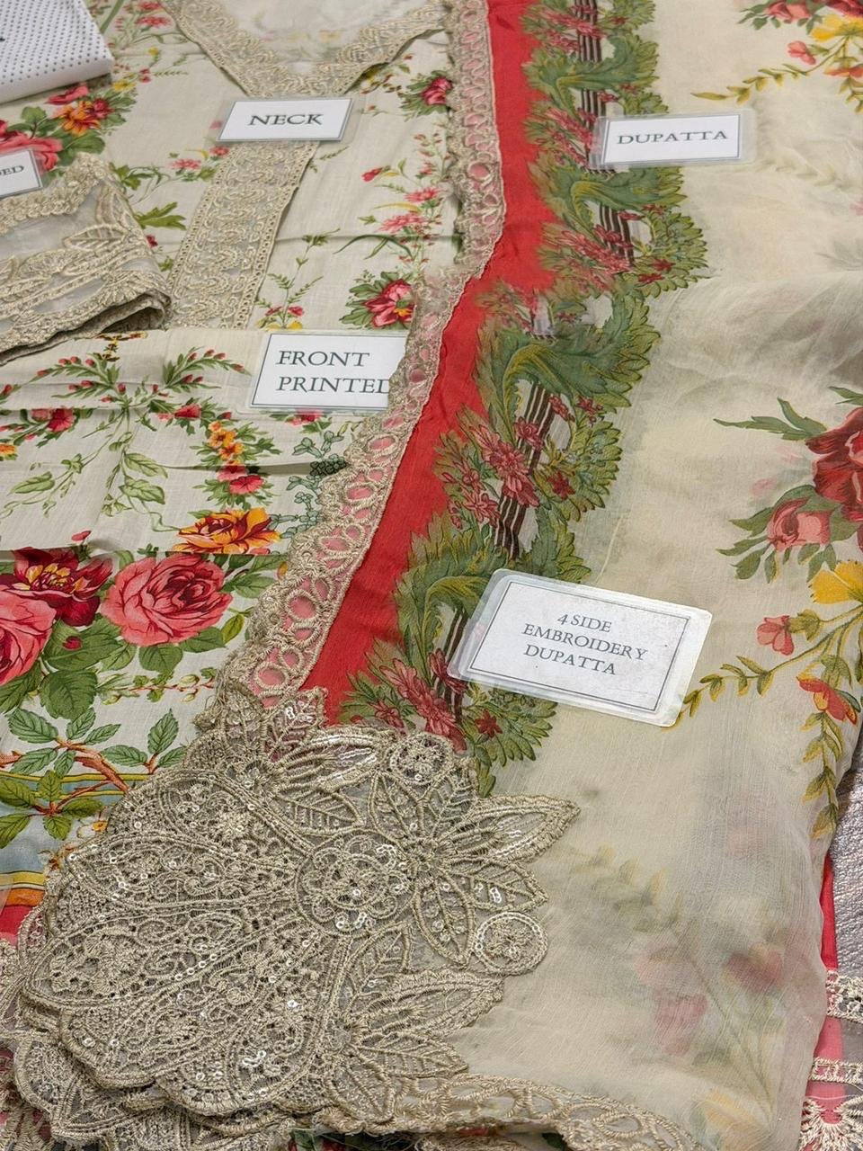chiffon printed duphta with 4 side embroidered spengle work duphta boarder attach with 4 side embroidered spengle work pallou bunches attach
