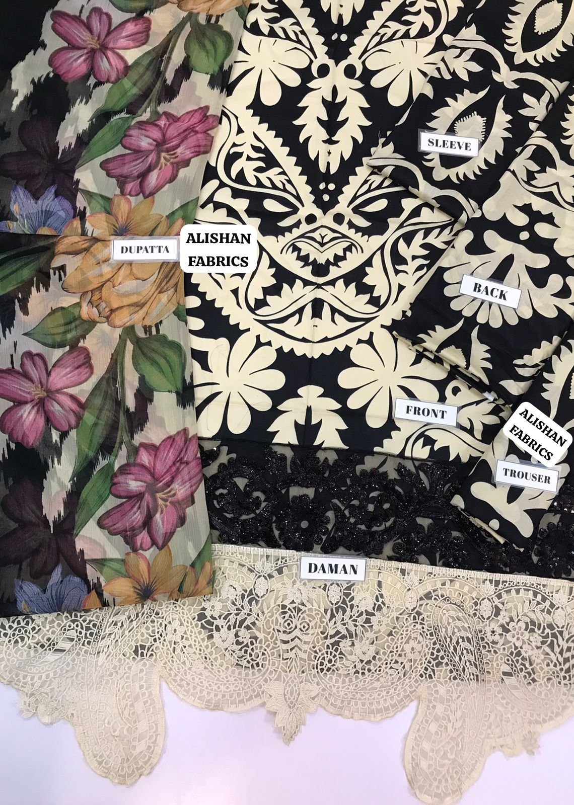 Printed lawn front with heavy embroidered spengle sequence work 1st Daman boarder with embroidered spengle work 2nd daman boarder