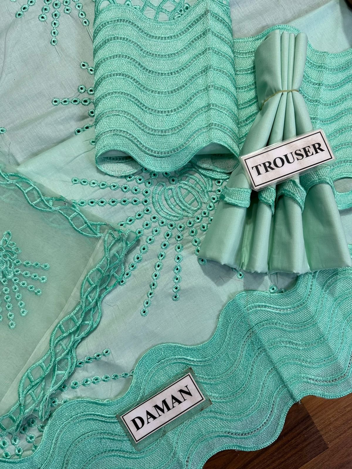 MUSHQ Cotton chicken kaari with organza dupata Front heavy chicken kaari along with daaman extension Heavy embroidery sleeves Plain heavy chicken kaari Plain trouser with trouser bunch Heavy embroidery organza duppatta