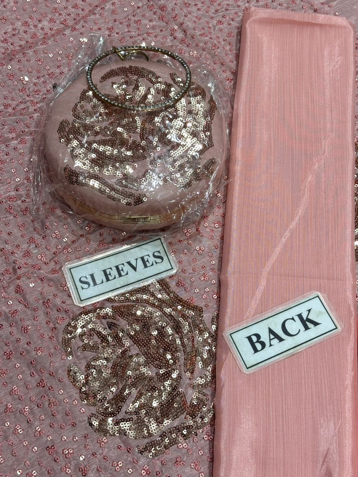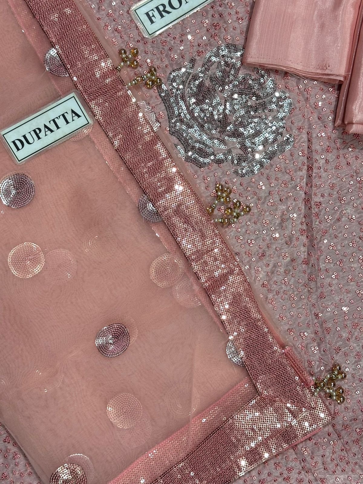 ORGANZA EMBROIDERED SEQUENCE FRONT EMBELISH WITH HANDWORK AND HANGING TUSSLES ON DAMAN